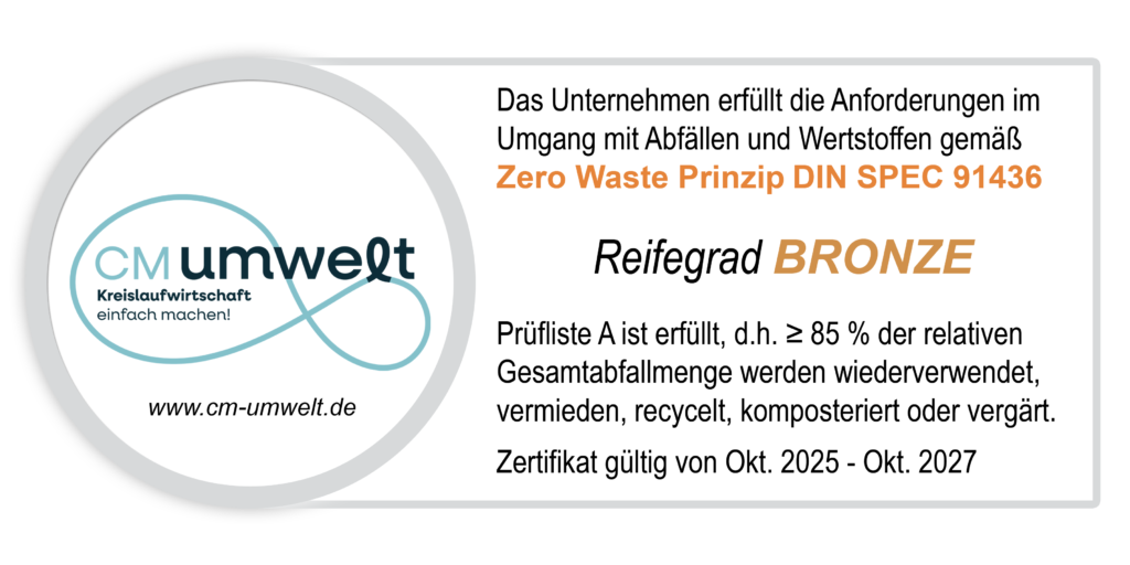 Im Rahmen unserer strategischen Umwelt- und Nachhaltigkeitspolitik und insbesondere im Rahmen der Zero Waste Vision haben wir uns mit der Zertifizierung gemäß DIN SPEC 91436 verpflichtet, die anfallenden Abfallmengen kontinuierlich zu reduzieren und deren Verwertung zu optimieren. Außerdem schaffen wir Voraussetzungen, die es ermöglichen, die eingesetzten Ressourcen solange wie möglich im Kreislauf zu führen und die Verwertungsalternativen entsprechend der Abfallhierarchie zu wählen.